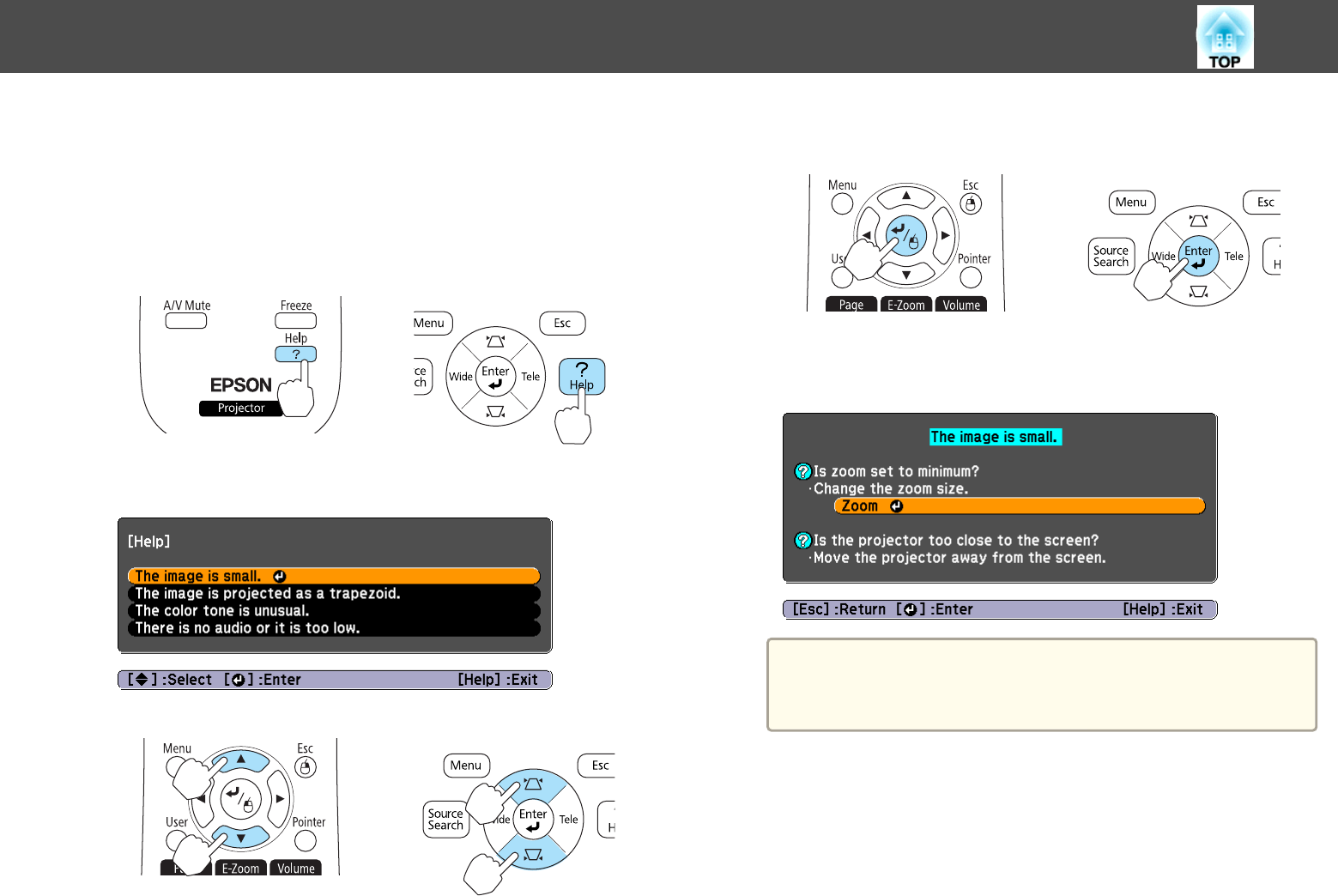 If a problem occurs with the projector, the Help screen is displayed to assist